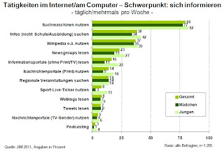 Immerhin steht Wikipedia an dritter Stelle, was die Informationssuche im Netz angeht, und wird von 37 Prozent der Jugendlichen mehrmals pro Woche aufgesucht, wie die JIM-Studie 2011 zeigt.